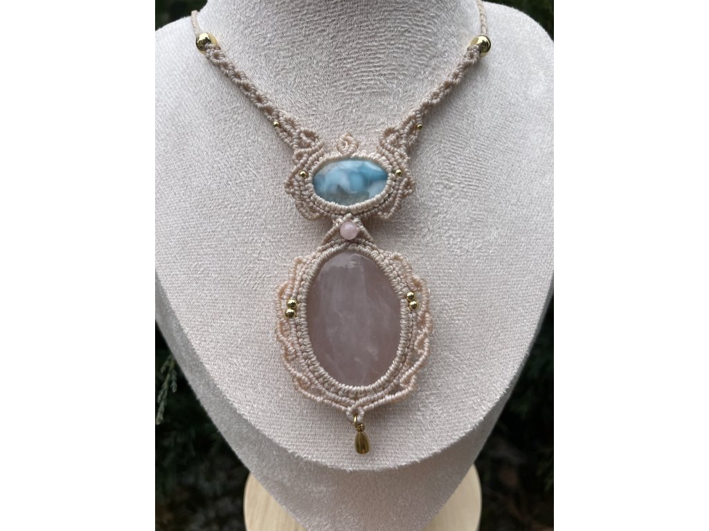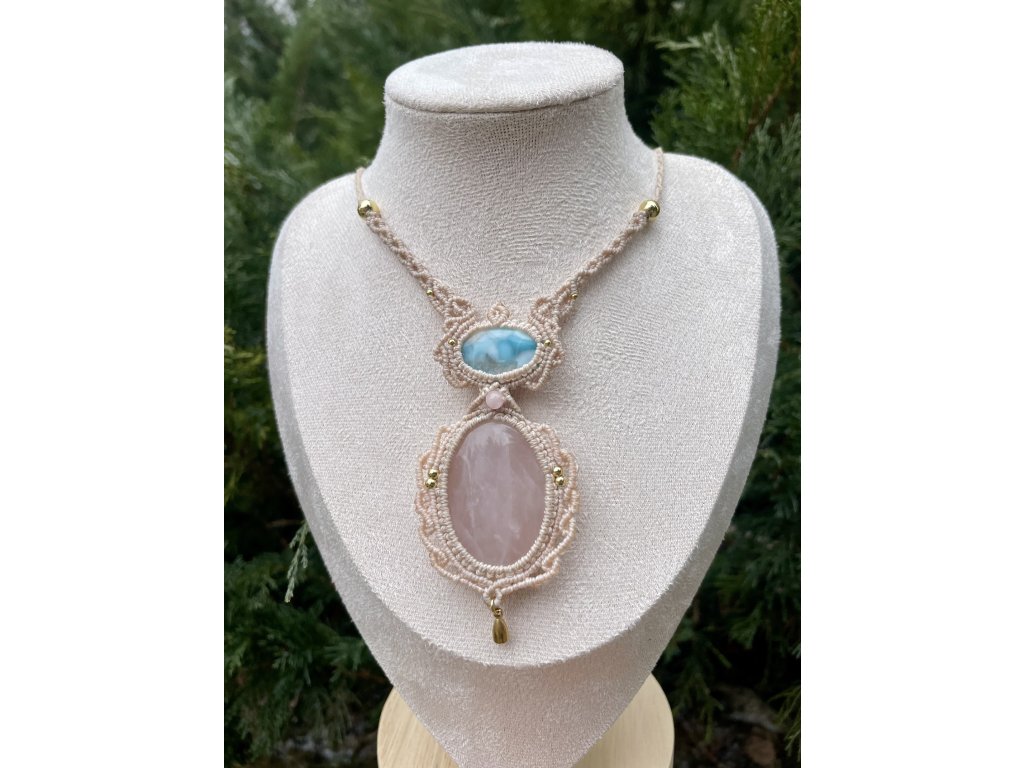 Macrame náhrdelník s Růženínem a Larimarem